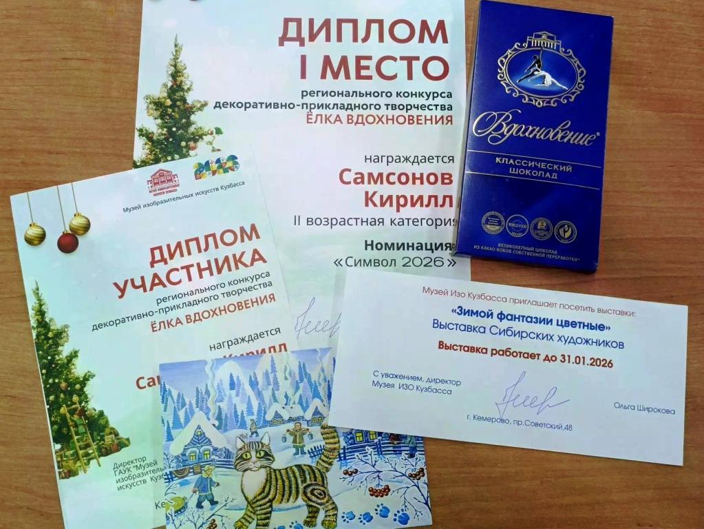 Самсонова Кирилла, обучающегося объединения «Волшебная кисточка» (рук. В.В. Патшина), занявшего I место в номинации «Символ 2026» регионального конкурсе декоративно-прикладного творчества «Елка Вдохновения»! Конкурс проводился ГАУК «Музей ИЗО Кузбасса».
